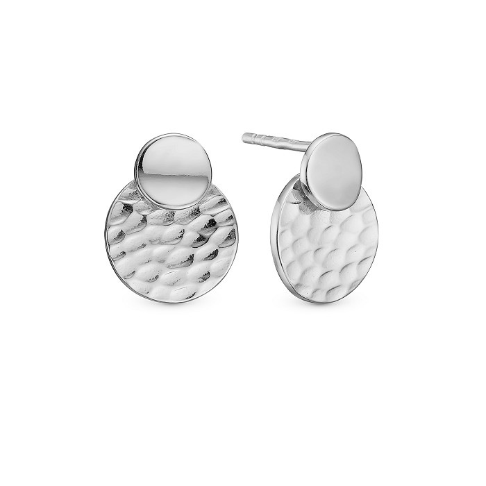 Smukke øreringe i sølv med en blank plade og en banket plade.