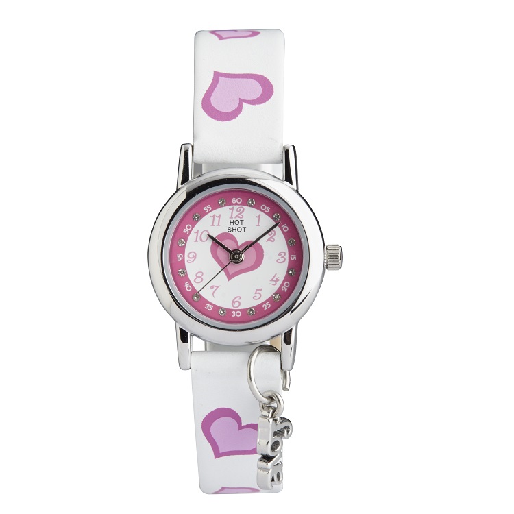 Hvid urskive med pynt og lyserøde markeringer og rem med hjerter