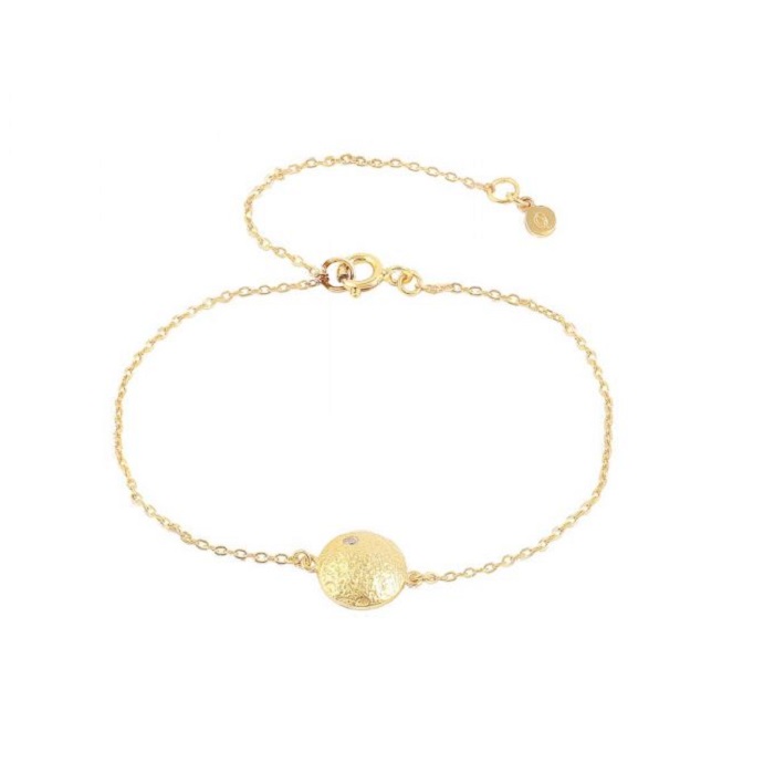 Armbåndet har et fint vedhæng med en rund plade som har en rå overflade.