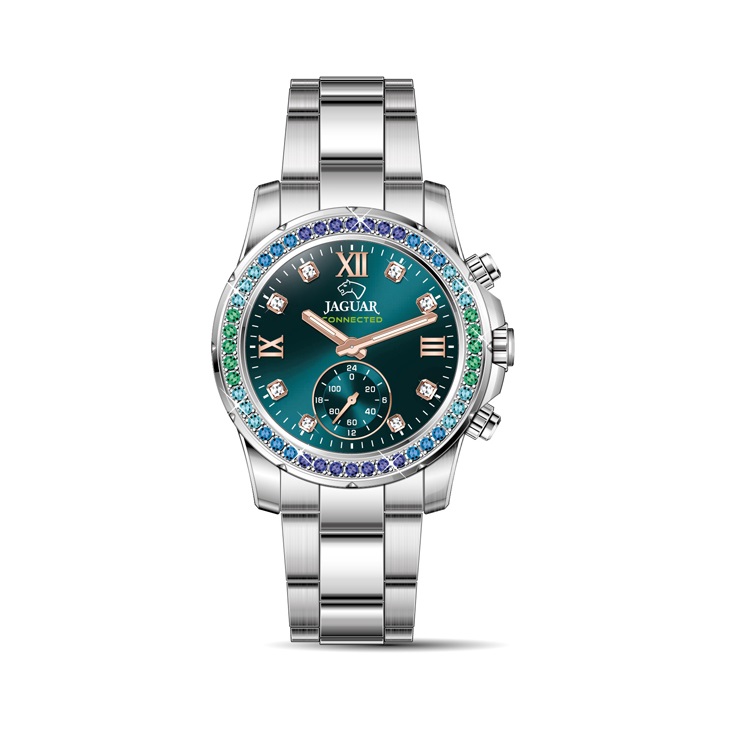 Jaguar Connected J980/6 er det ultimative udtryk for stil og funktionalitet. Dette elegante dameur fra Jaguar Connected Lady-kollektionen er designet til at imponere med sit grønne urskive og de flerfarvede sten på bezelen, der giver uret et moderne og stilfuldt look.