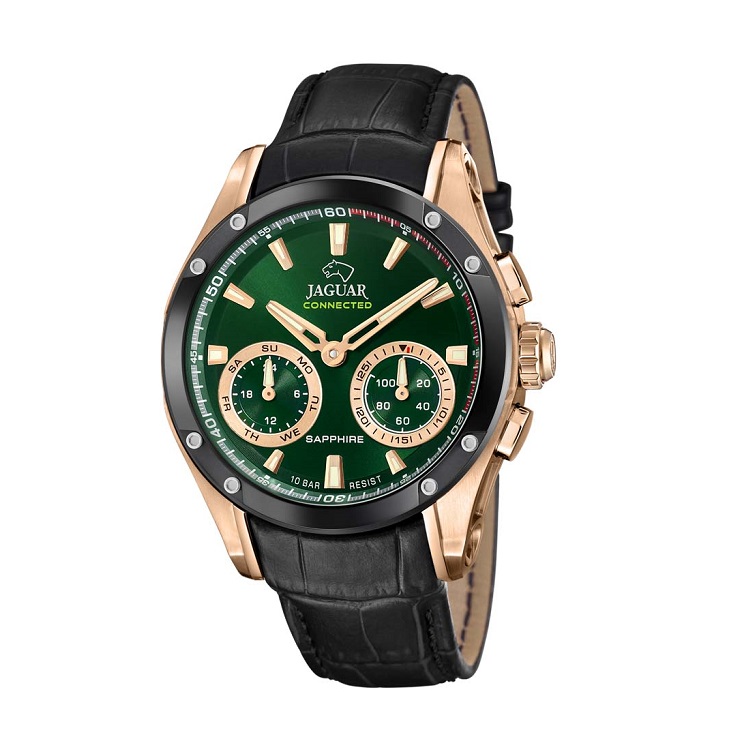 Dette ur har en 45 mm urkasse i rustfrit stål og en grøn urskive, som er elegant kombineret med en sort læderrem. Uret har et hybrid værk, som kombinerer en traditionel kvartsur værk med en Bluetooth-forbindelse, der giver dig mulighed for at tilslutte uret til din smartphone og modtage opkald og notifikationer direkte på dit ur.