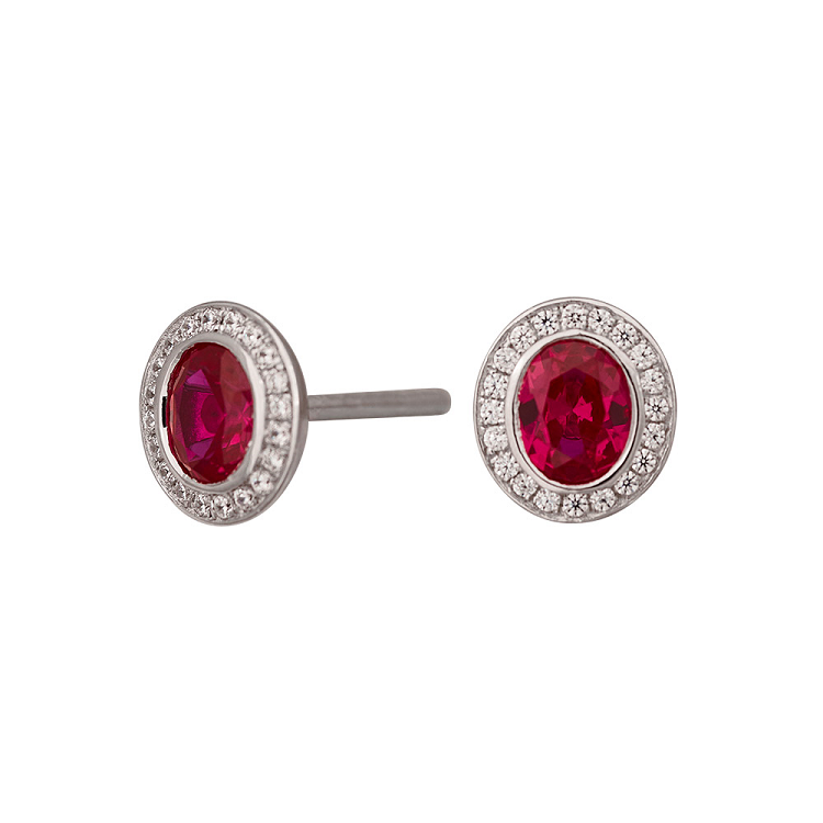 Øreringene har en smuk krans af klare/hvide zirkoner som omraknser en syntetisk smuk rød rubin.