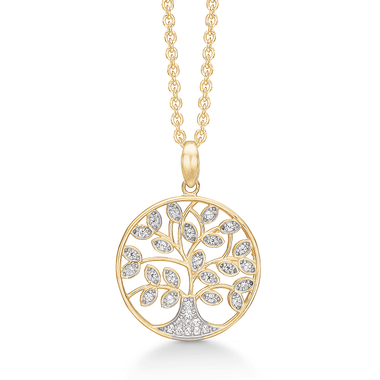 Smuk halskæde i 8 kt. ægte guld med Livets Træ med hvide sten som blade