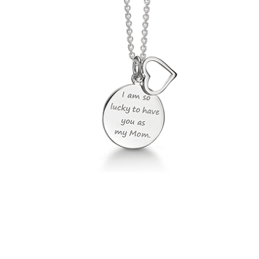 Fin halskæde i sølv med rund plade med tekst og et lille hjerte.