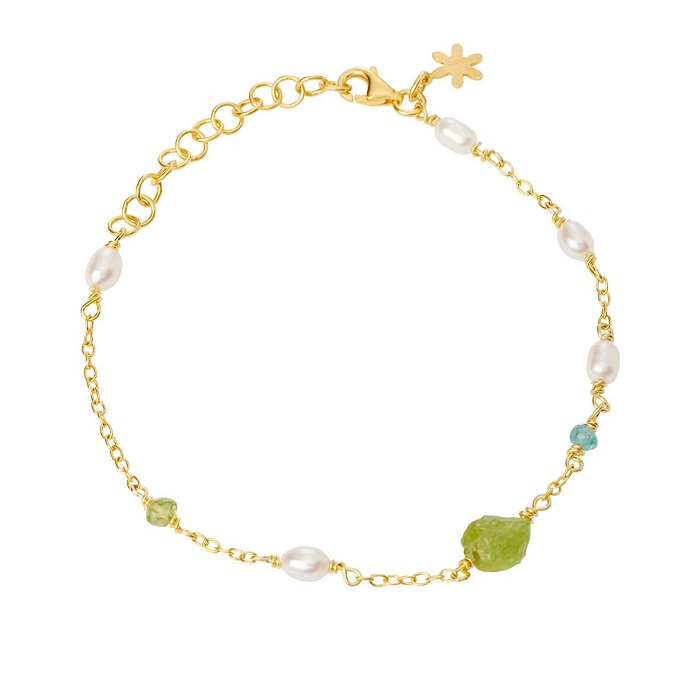 Flot armbånd i forgyldt med grønne sten, en enkelt blå sten og perler.