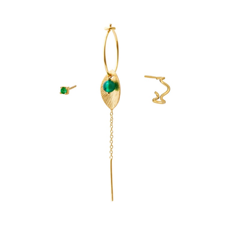 Smukke øreringe i forgyldt sterling sølv 925, sæt med 3 enkelte øreringe med grønne sten.