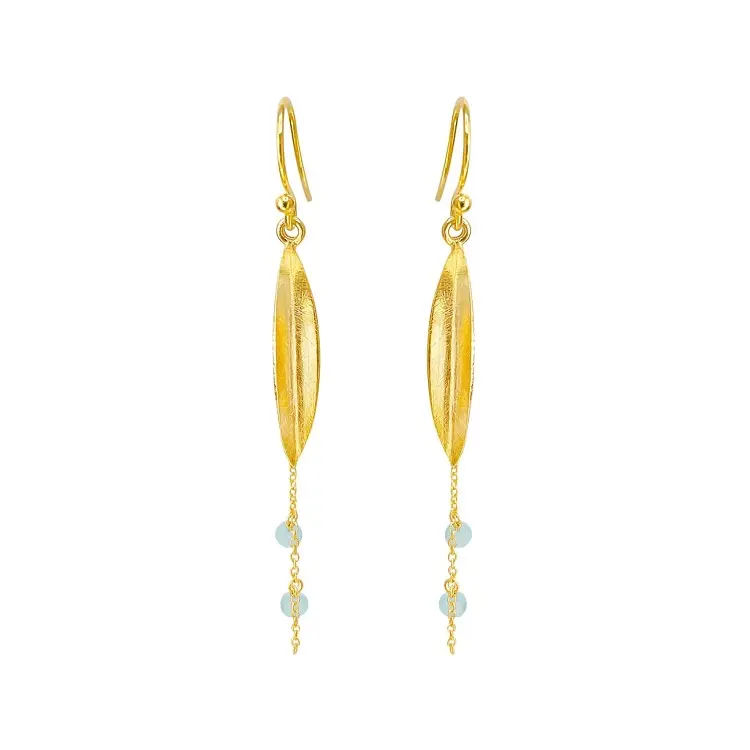 Fine øreringe i forgyldt sølv med blad, kæde og amazonit