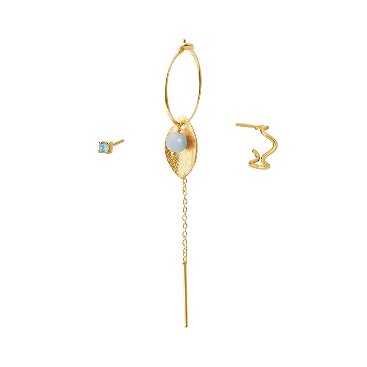 Smukke øreringe i forgyldt sterling sølv 925, sæt med 3 enkelte øreringe med blå sten.