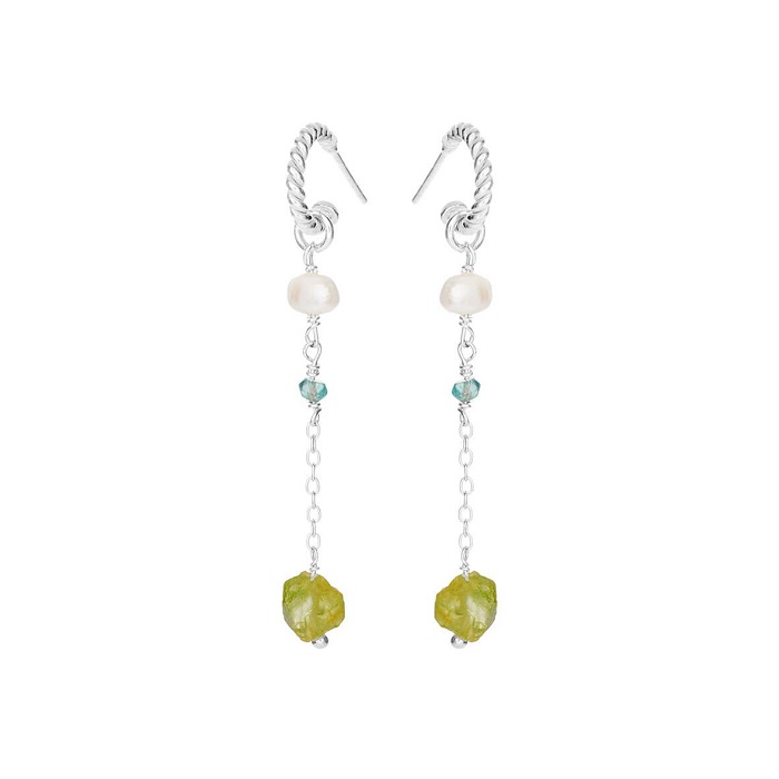 Smukke øreringe i sølv med en flot perle, blå og grønne sten.